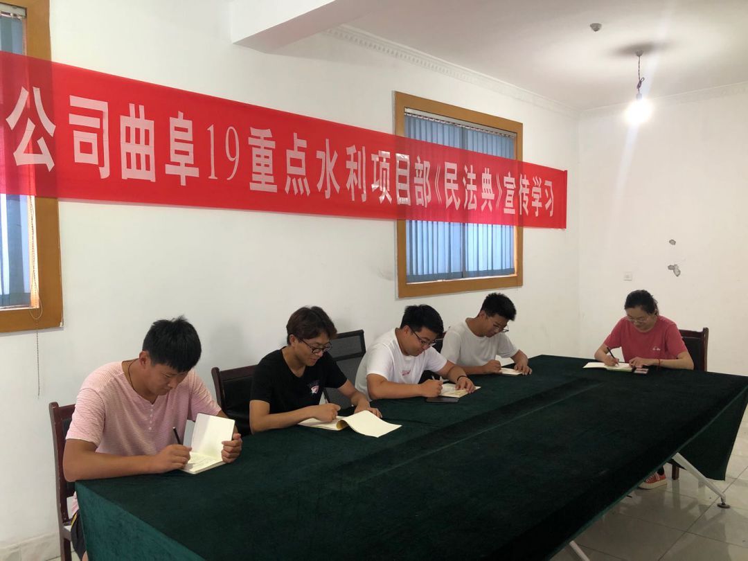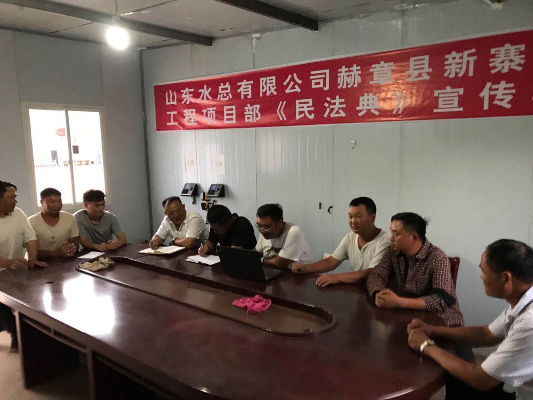 为响应总公司法务与清收办公室组织的“《民法典》宣传月”活动, 7月23日晚上,泗水县黄阴集大闸除险加固工程项目经理部在工地会议室召开《民法典》学习宣贯会议、2020年7月25日,赫章县新寨水库工程项目部全体成员在会议室进行《民法典》宣传学习、曲阜2019年重点水利建设项目施工 一标段在2020年7月28日进行《民法典》学习、平塘县擦耳岩水库工程项目2020年7月29日进行《民法典》学习、宣贯情况汇报如下: