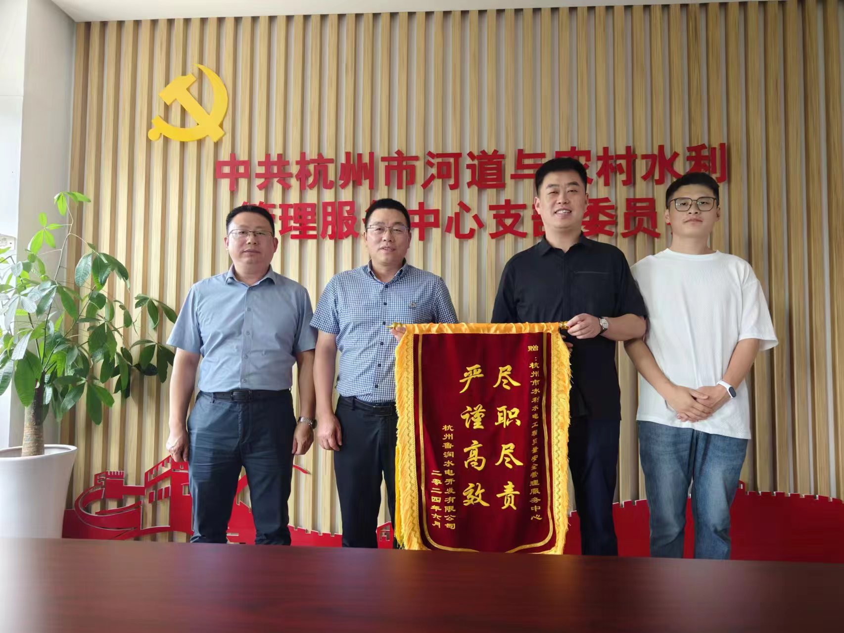 近日,杭州鲁润公司总经理孟天琦带队到杭州市水利水电工程质量安全管理服务中心,赠送“尽职尽责 严谨高效”锦旗,服务中心主任叶利伟、副主任潘志军接过了这一传递着深深的感谢与敬意的锦旗。